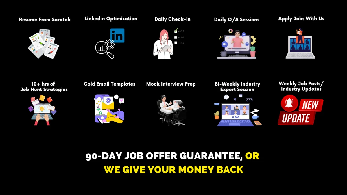Most members spend 5–7 hours per week on sessions, applications, and networking. The system is designed for busy professionals. However, we do need you to spend atleast 1 hr a day and book weekly 1-on-1 calls with our mentors so that we can track your progress and guide you towards that job offer.